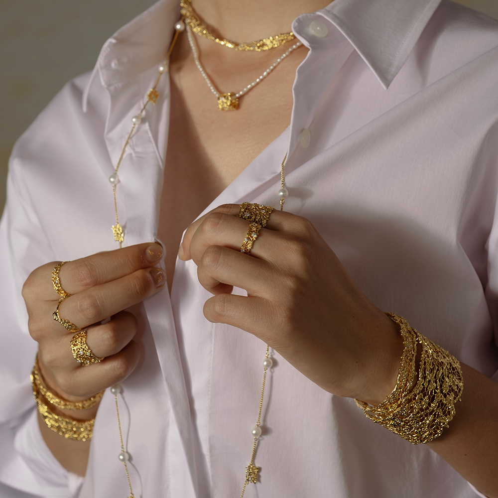 The vision of Leavers Lace serves as the inspiration for the patterns of the series, blending with metallic textures to evoke the delicate and romantic nature of lace while outlining the interplay of lace's softness with the resilience of metal.